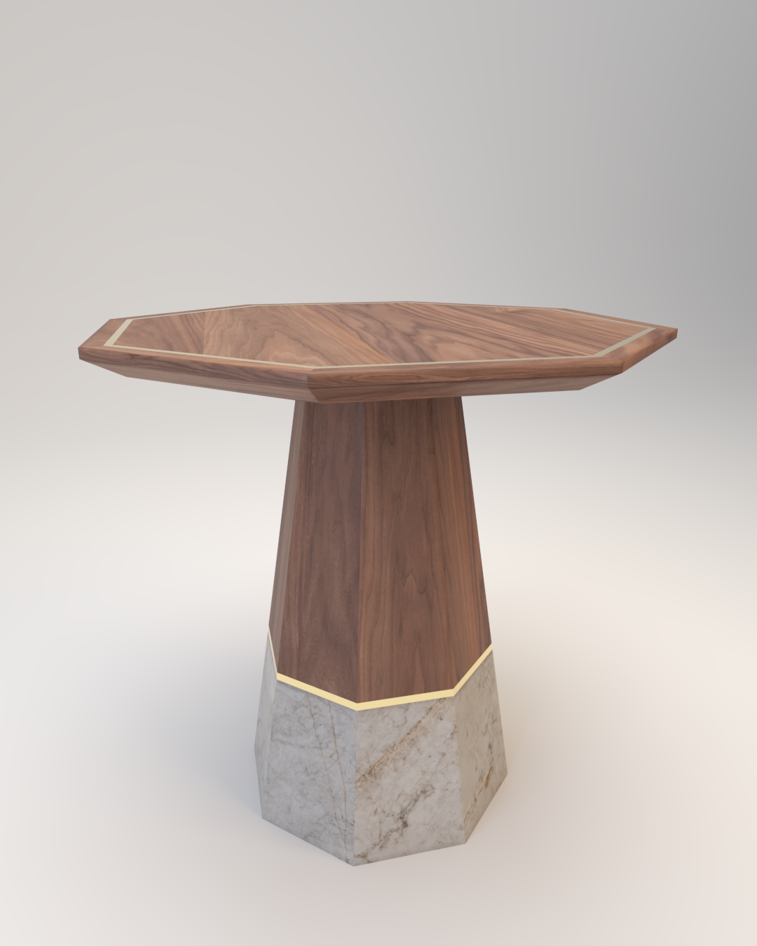 A hardwood table with stone and metal accents. This table makes any room feel grounded. A sturdy marble base divided from a walnut top by a small band of gold, The Good Earth will make for the perfect entry table.