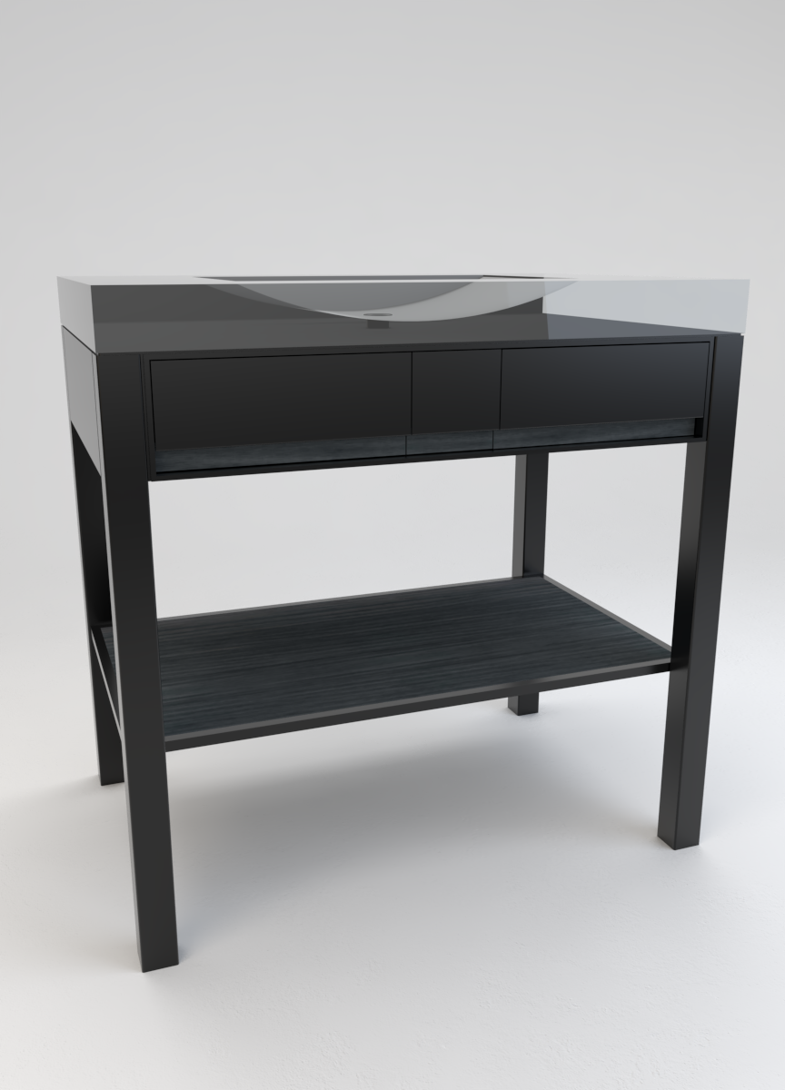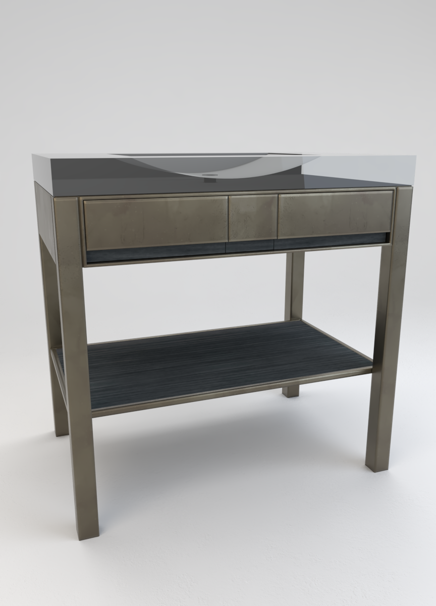 A steel vanity with dark wood accents and glass top. The Raven is sleek and modern, with a hint of the industrial. The integrated hand hold for pulling out the drawers means no hardware will disrupt the smooth lines. The metal body offers many options for metallic finishes to be softened by the wood accents.